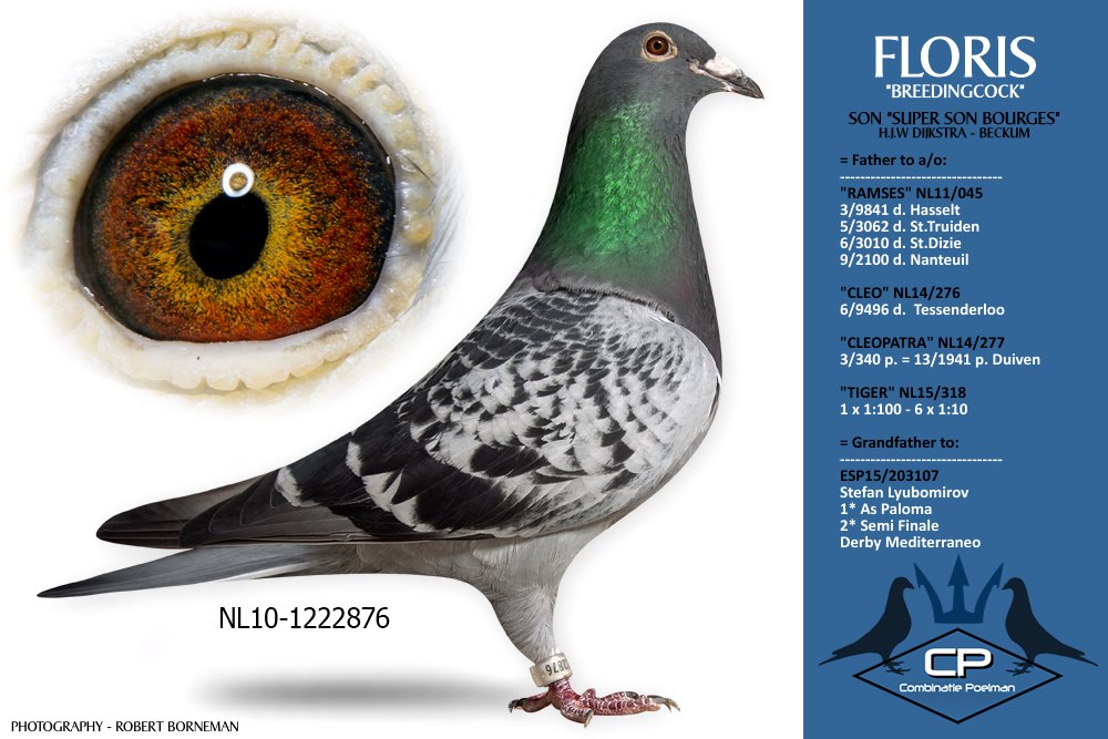 Floris is a full brother of top class breeder Fleur, which we already mentioned. This is another cock with a proven record in the breeding loft. He is for instance the sire of Cleo (winner of a 6th Prov. Tessenderlo against 9,496 pigeons) but also of Ramses: