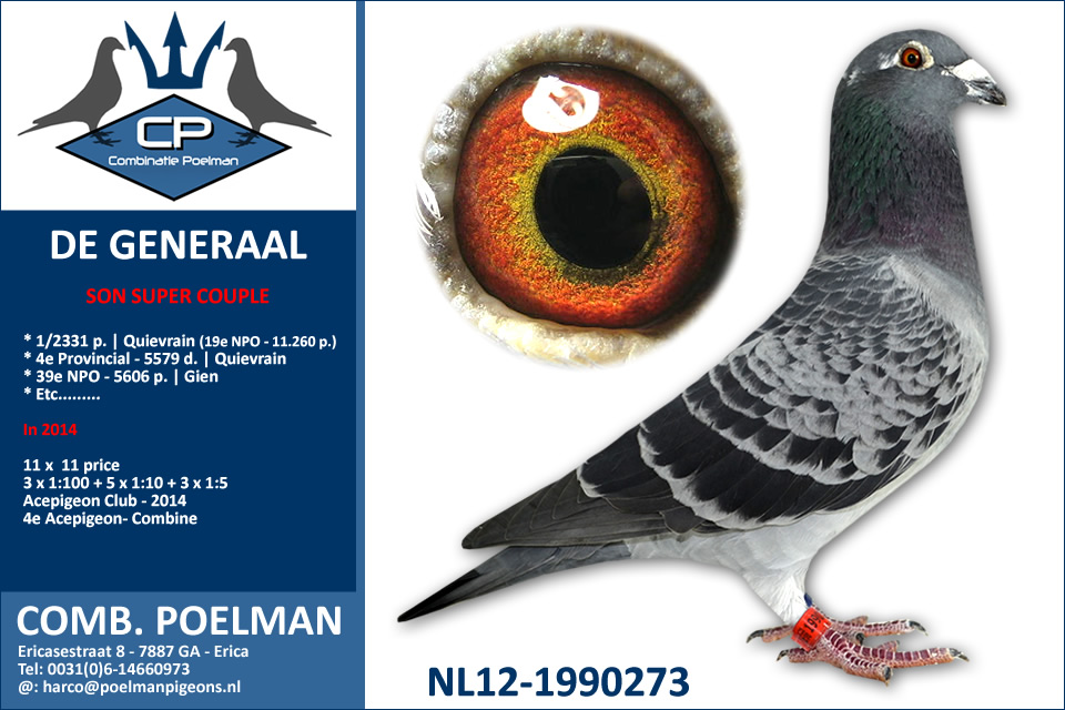 One of the most important racing birds in recent seasons is without doubt De Generaal. This is a son of Wondere Arrow x Fleur, and he has won quite a few prizes over the years: