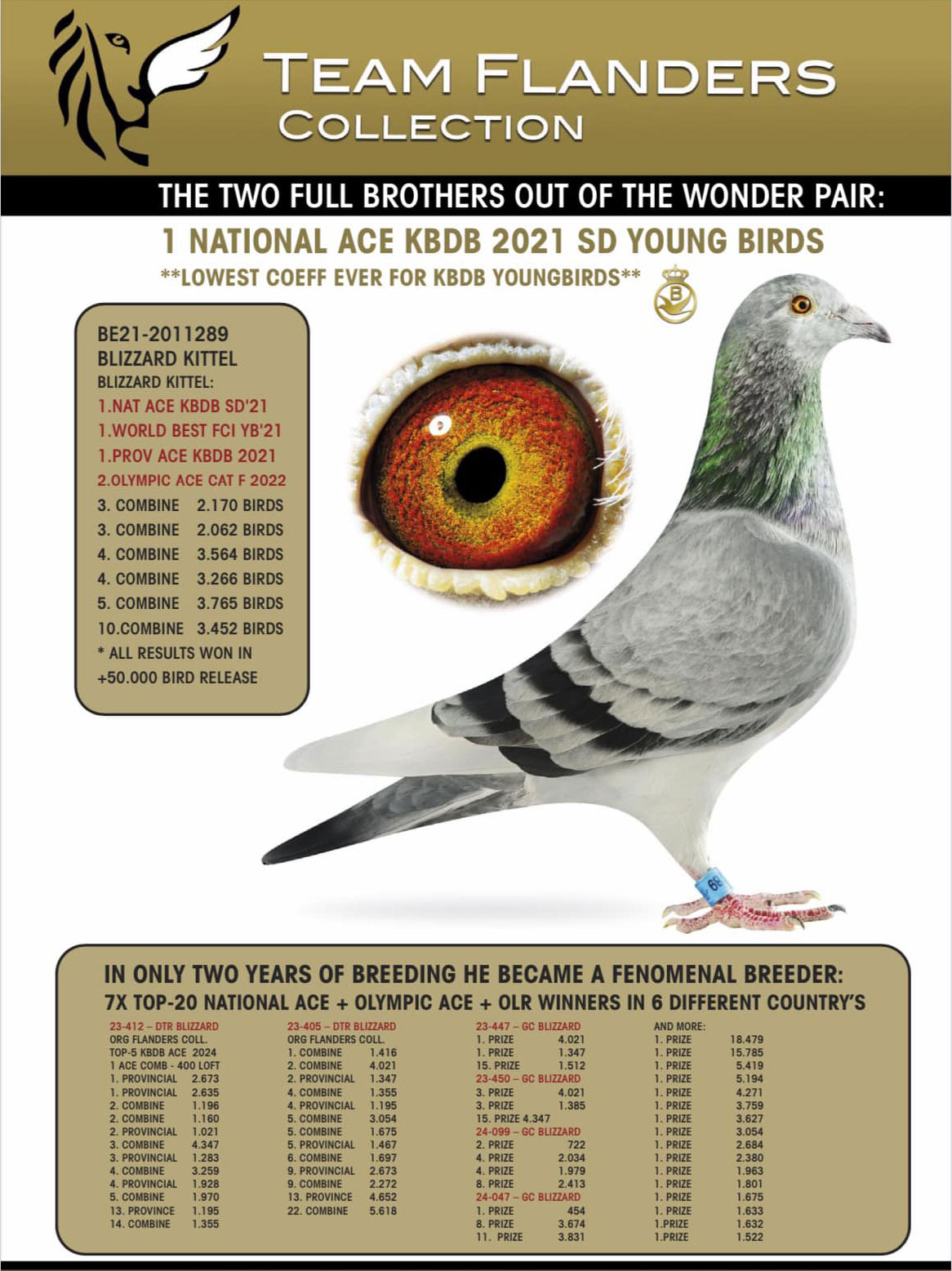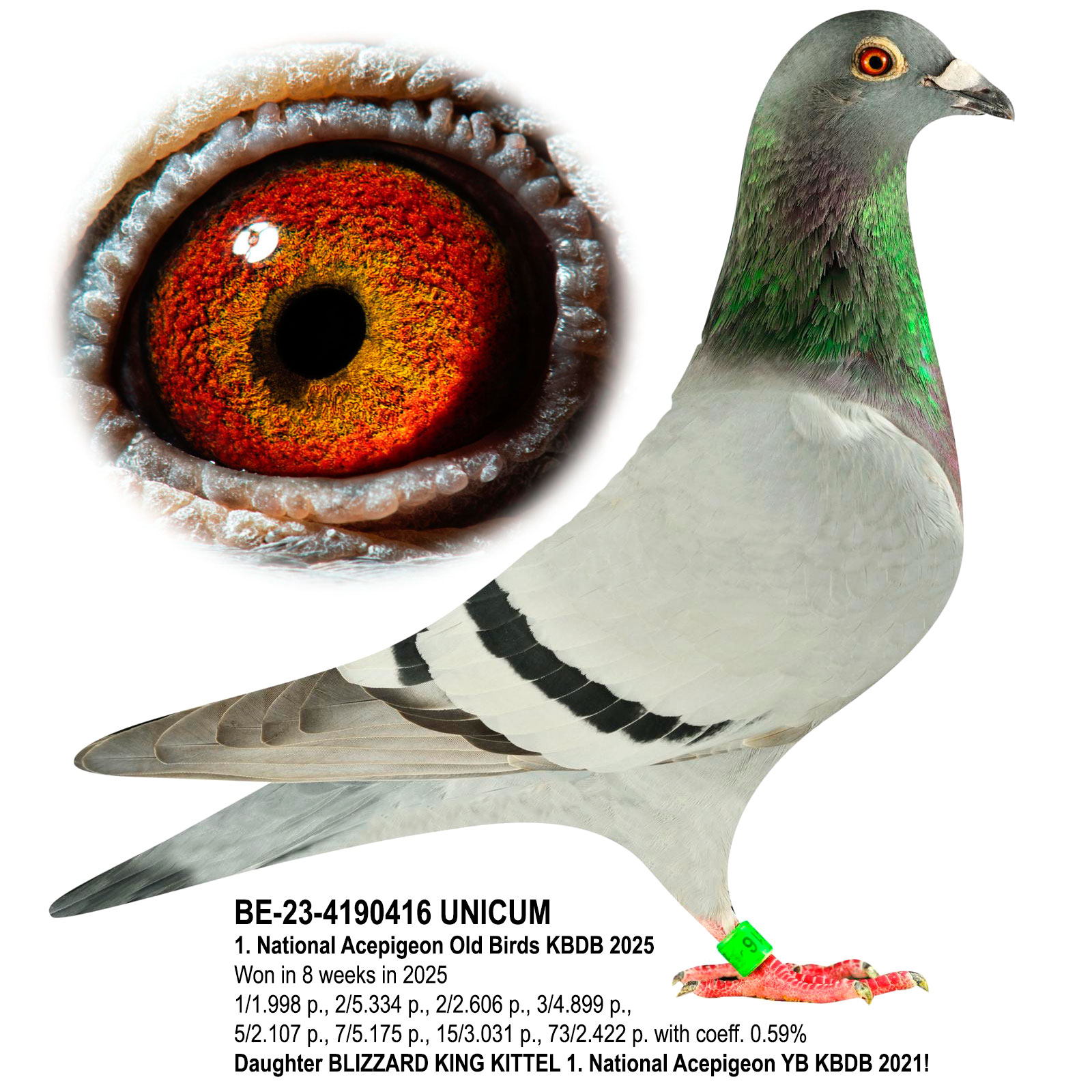 In the first 8 races of the season 2025, Deridder-Van Den Brande accomplished to win the 6 results for KBDB ace pigeon, what was never done before. The direct daughter of wonder breeder Blizzard won 6 prizes with total coefficient 0.59%, and was after named “Unicum Blizzard” referring to her unique achievement in Belgium pigeon sport. Beside breeding the first national ace KBDB, blizzard was also responsible for several other KBDB aces for Deridder Van Den Brande like: