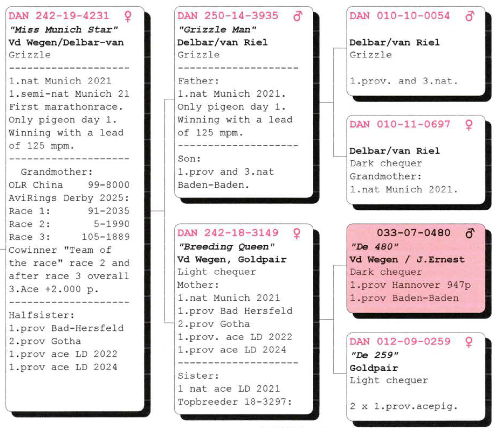 MISS MUNICH is daughter of GRIZZLE MAN & BREEDING QUEEN – both from proven longdistance origins on the loft.