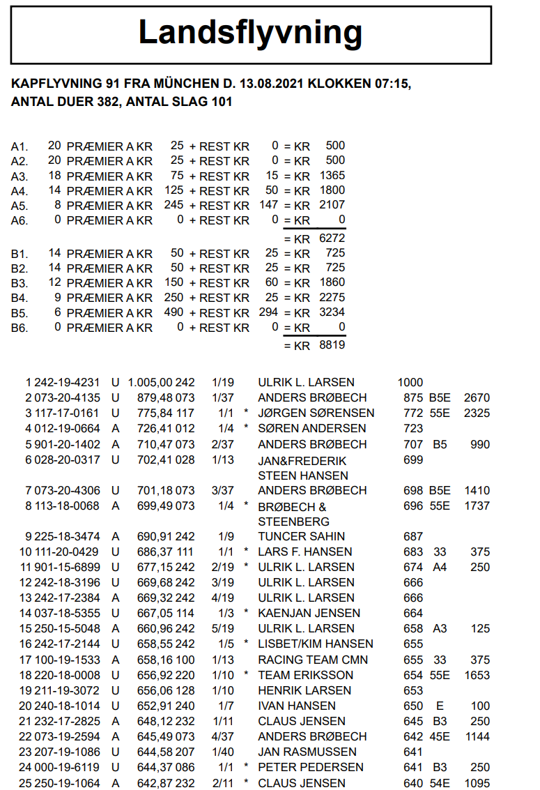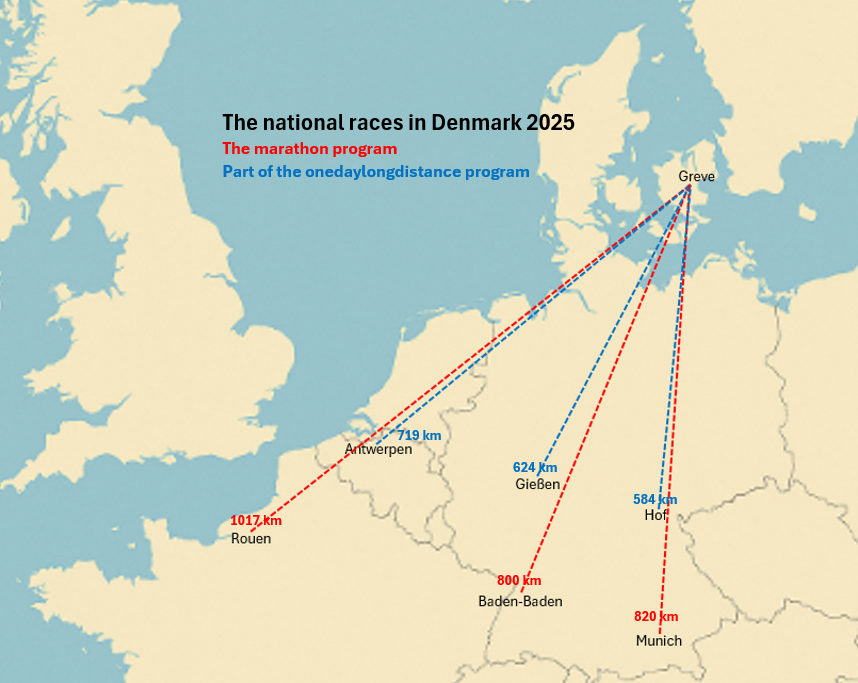 As you can see on the map – almost all destinations in Denmark demand the pigeons to fly over the sea – and also going to Team Ulrik Larsen.