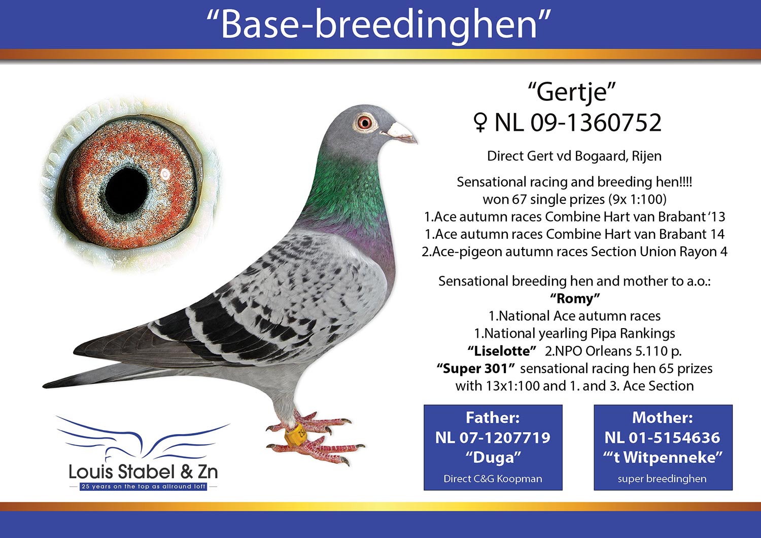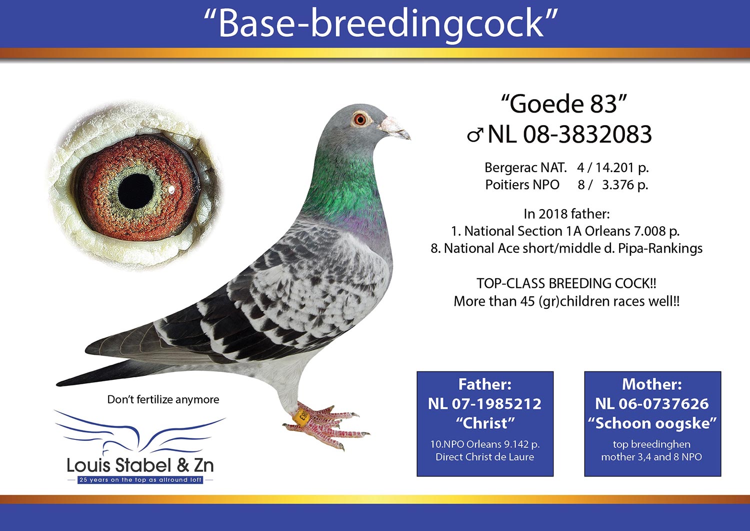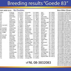 Son of FRANKIE – a topbreeder and father/grandfather to a lot of good racers on the NPO races!! He is (grand)father to a.o.: