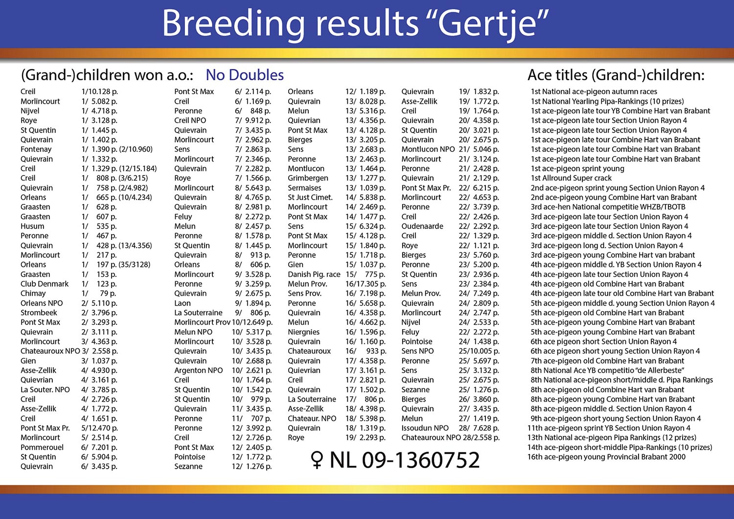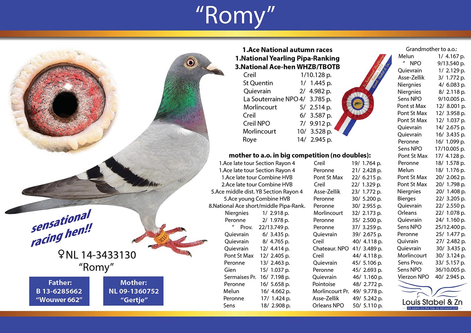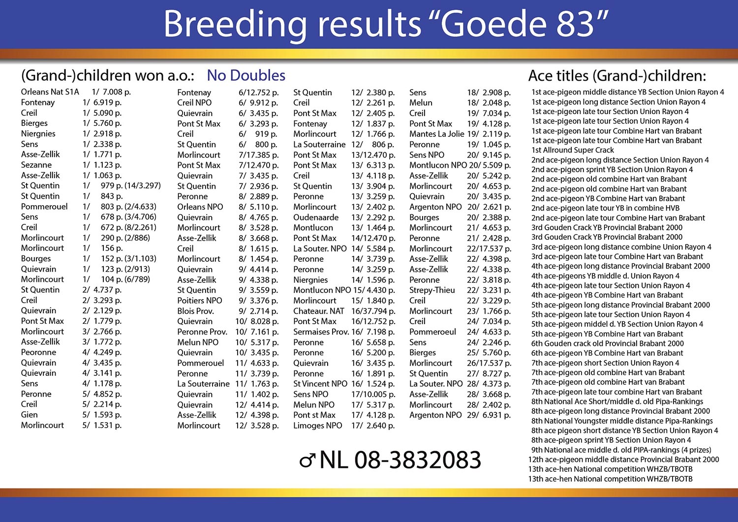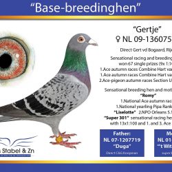 Nestbrother to LIMOGESKE – a super hen with on NPO races: 3,30,36,69,76,93,127,144,164 NPO!!!