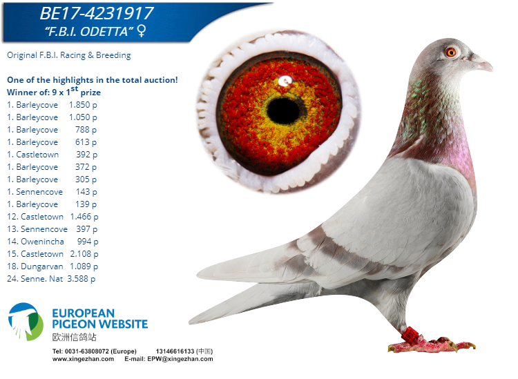 Full sister FBI ODETTA. FBI ODETTA won 9 x 1 and was 2. Ace-pigeon 2018 and 2. National BBLM.