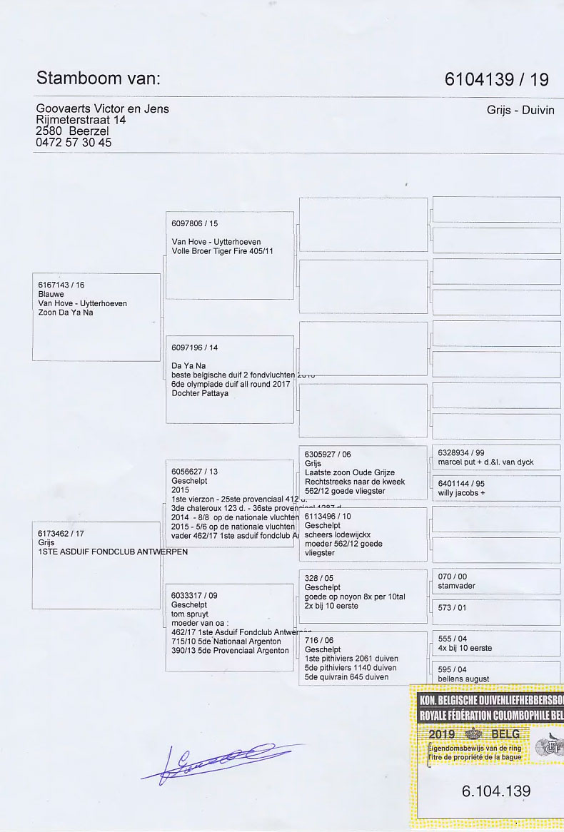Dam: BE-19-6104139 GRIZZLE PRINCESS, Org. Verdeyen Racing Pigeons