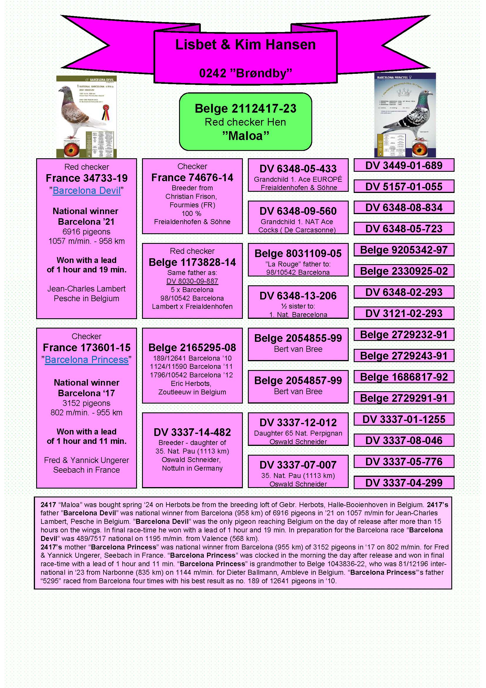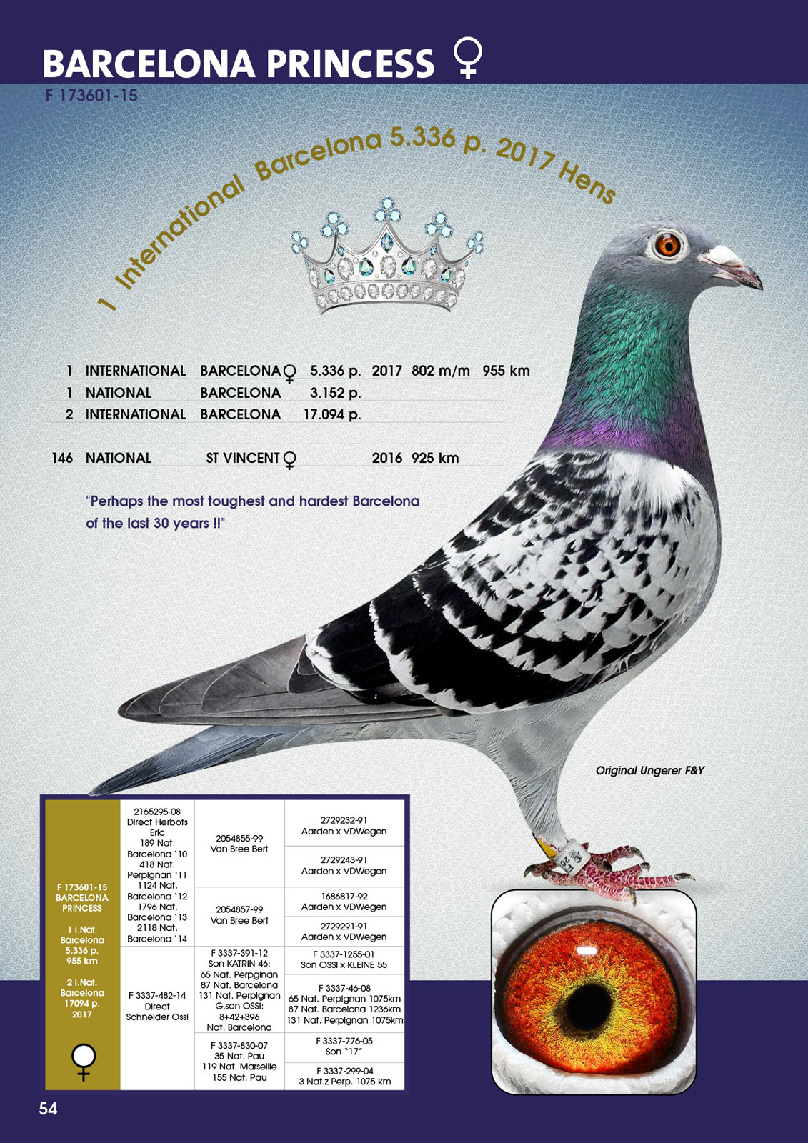 National winner Barcelona ‘17 3152 pigeons 802 m/min. – 955 km Won with a lead of 1 hour and 11 min!!