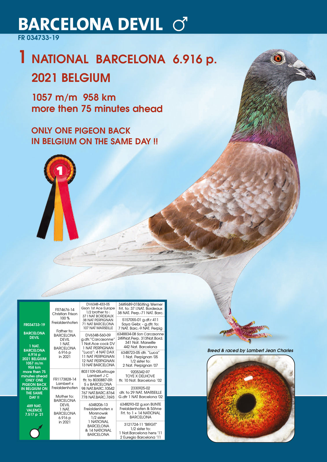 National winner Barcelona ’21 6916 pigeons 1057 m/min. – 958 km Won with a lead of 1 hour and 19 min!!!