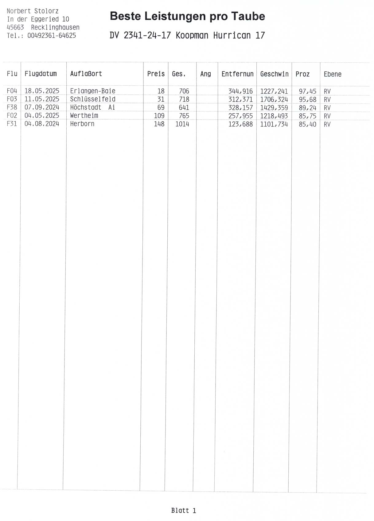 24. prize 6,086 birds Provincial 202 Km Fulda