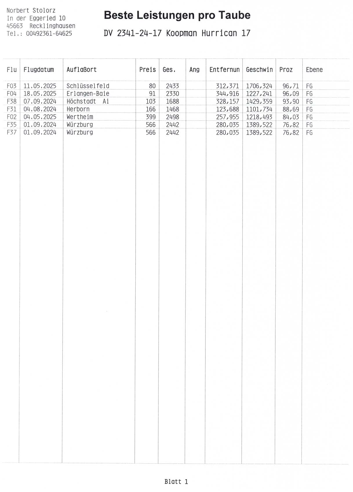 48. prize 3,803 birds Provinzial 338 Km Forchheim I etc.