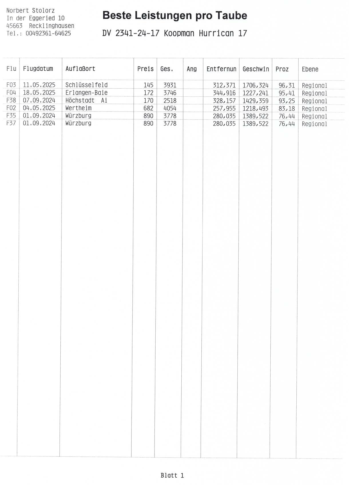31.       prize               718 birds   Union                               312 Km Schlüsselfeld