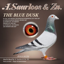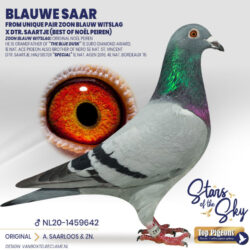 Sire is “Blauwe Saar”, a direct son of “Zoon blauw Witslag”, which is father of among others 4. Nat. Pau 2020 but most important grandfather of the unique “The Blue Dusk” – winner of 1e Euro Diamond Award, 2. Nat. Acepigeon ZLU ’16, 4. Nat. Acepigeon ZLU ’17, 5. Nat. Perpignan ’17, 12. Nat. St. Vincent ’16, 17. Nat. St. Vincent ’17, 27. Nat. Perpignan ’16. “Zoon blauw Witslag” is fullbrother of 2. Nat. St. Vincent ’13, 5. Nat. St. Vincent ’15, 8. Nat. Cahors ’16 etc. by Noel Peiren.
