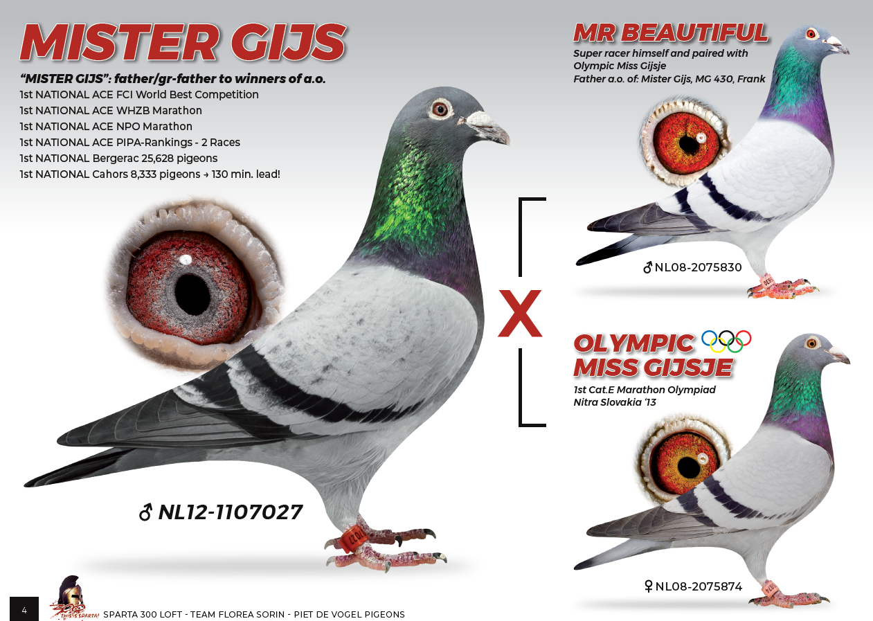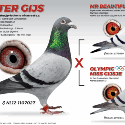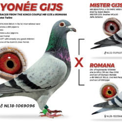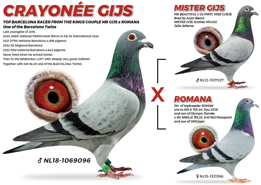 Dam is directly daughter of the star “Crayonne Gijs” – a super racer with 2 early prices from Barcelona and breeder of several winners at Piet de Vogel. Now “Crayonne Gijs” is now sold to Sorin Florea in Romania. “Crayonne Gijs” is son of the super couple “Mr. Gijs” and “Romana” at Piet de Vogel. A fullbrother of “Crayonne Gijs” is father of “Queen Léa” 1. Nat. Barcelona 2024 – 6.310 birds.