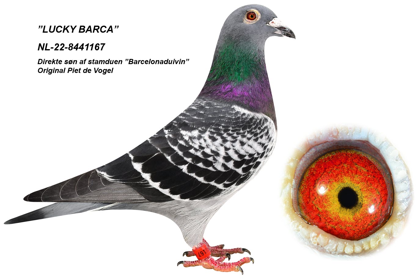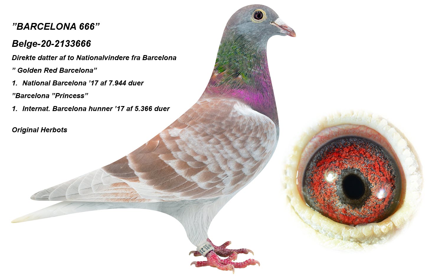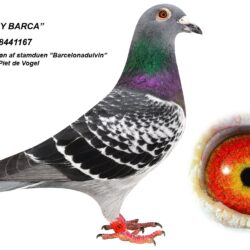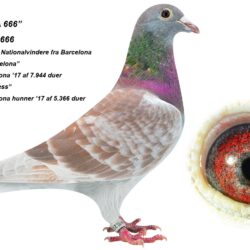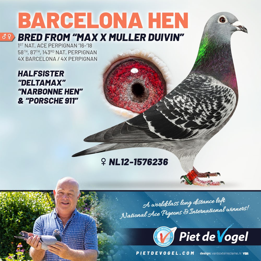 Dam is breed from a son of the excellent racing hen “Barcelona duivin” at Piet de Vogel – 1st Acepigeon ZLU Perpignan 2016-2018 and winner of 58. Nat. Perpignan ZLU 2017 – 4.789 birds; 87. Nat. Perpignan ZLU 2018 – 3.778 birds; 143. Nat. Perpignan ZLU 2016 – 4.027 birds; 190. Nat. Barcelona ZLU 2015 – 5.183 birds; 288. Nat. Barcelona ZLU 2018 – 3.912 birds; 863. Nat. Barcelona ZLU 2014 – 5.423 birds; 890. Nat. Perpignan ZLU 2015 – 5.589 birds and 1.267. Nat. Barcelona ZLU 2016 – 5.239 birds. The son of “Barcelona duivin” is here mated to a granddaughter of ”Golden Red Barcelona” 1. Nat. Barcelona 2017 – 7.944 birds and ”Barcelona Prinsess” 1. Nat. Barcelona 2017 – 3.152 birds, 1. Internat. Barcelona hens 2017 – 5.336 birds and 2. Internat. Barcelona 2017 – 17.094 birds.