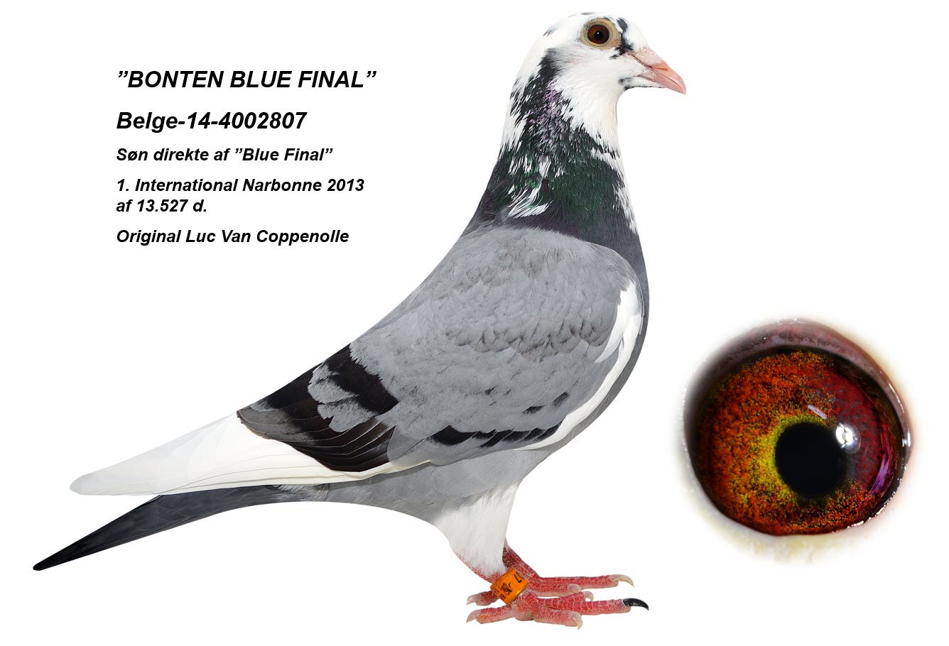 Sire is direct son from foundation cock “807”. He is a direct son of 1. International Narbonne 2013 – 11.448 birds at Luc van Coppenolle mated to a granddaughter of ”Golden Red Barcelona” 1. Nat. Barcelona 2017 – 7.944 birds and ”Barcelona Prinsess” 1. Nat. Barcelona 2017 – 3.152 birds, 1. Internat. Barcelona hens 2017 – 5.336 birds and 2. Internat. Barcelona 2017 – 17.094 birds.
