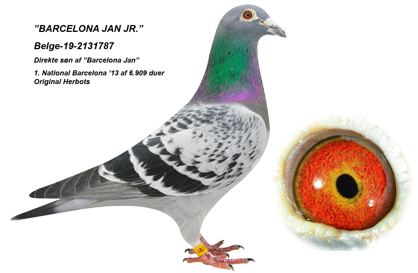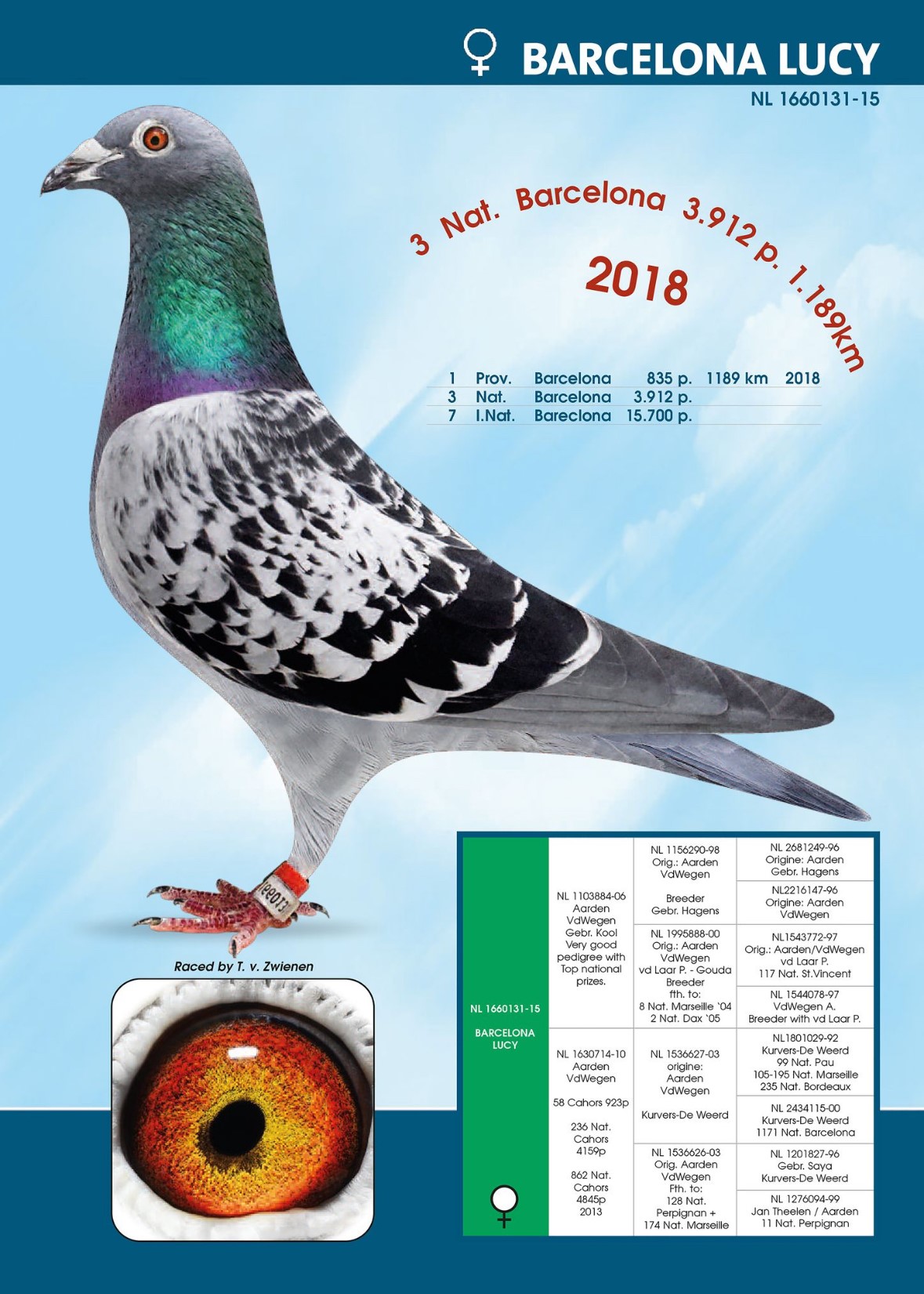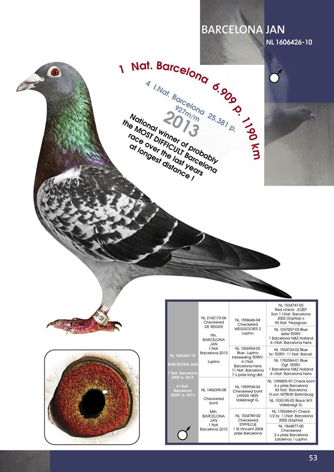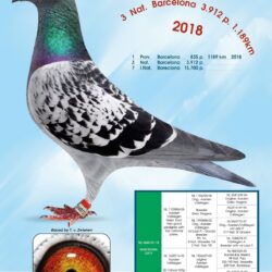 Sire is a direct son of ”Barcelona Jan” 1. Nat. Barcelona 2013 – 6.909 birds and of “Barcelona Lucy” 1. Prov. Barcelona – 835 birds; 3. Nat Barcelona – 3.912 birds and 7. Internat. Barcelona 2018 – 15.700 birds.