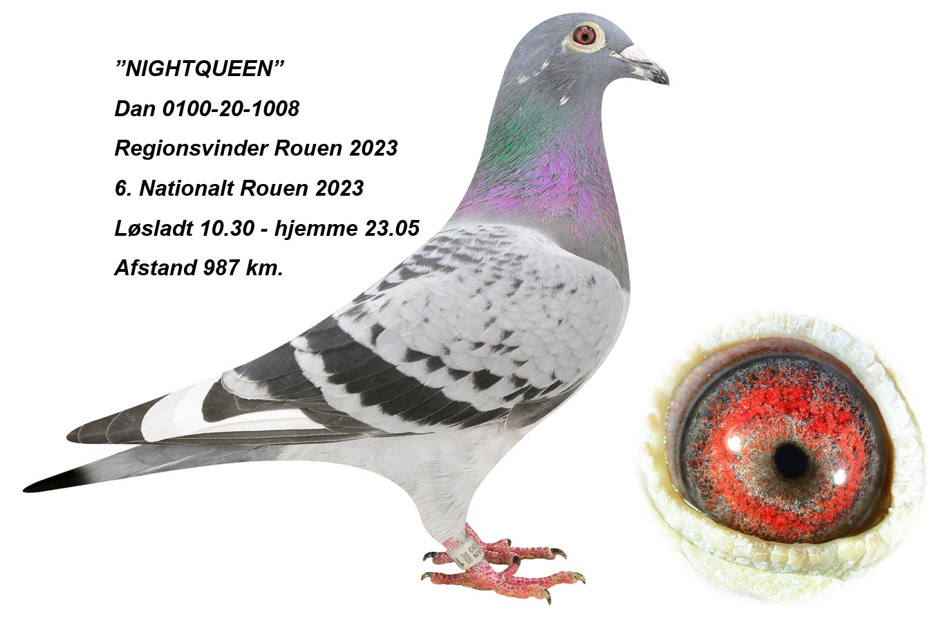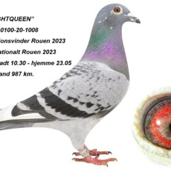 Dam is “Nightqueen”. A proven racer at the Marathon but now moved to the breeding loft. In 2023 “Nightqueen” won 1. Seminat. and was the only pigeon home at the day of liberation from Rouen in France at the distance of 987 km. She was clocked at 23.05 in the total darkness. “Nightqueen” is a grandchild from “Sproete Final”, a fullsister of “Blue Final” winning 1. International Narbonne ’13 -11.448 d. at Luc van Coppenolle.