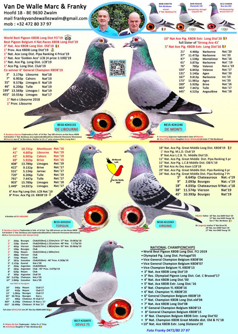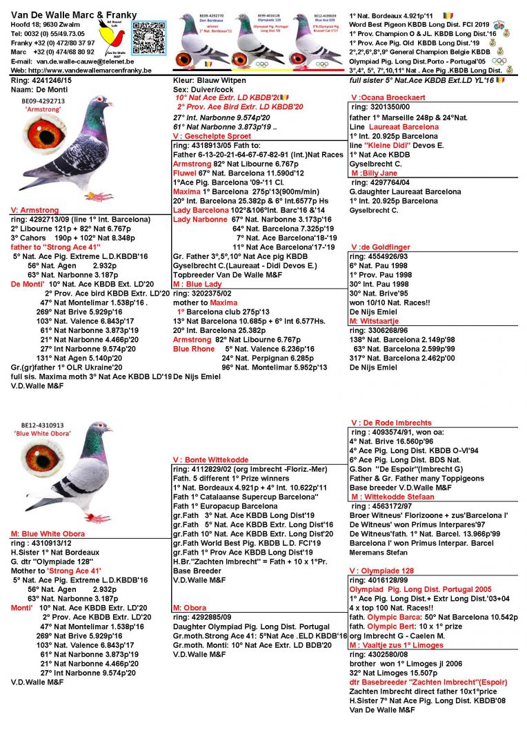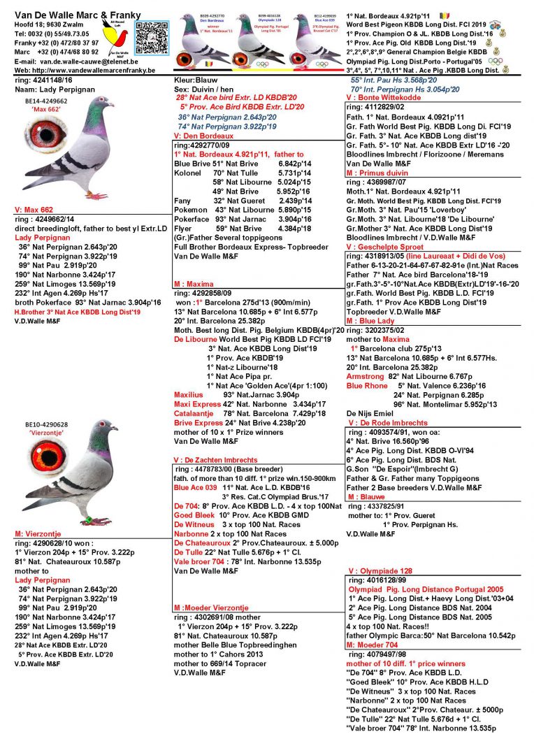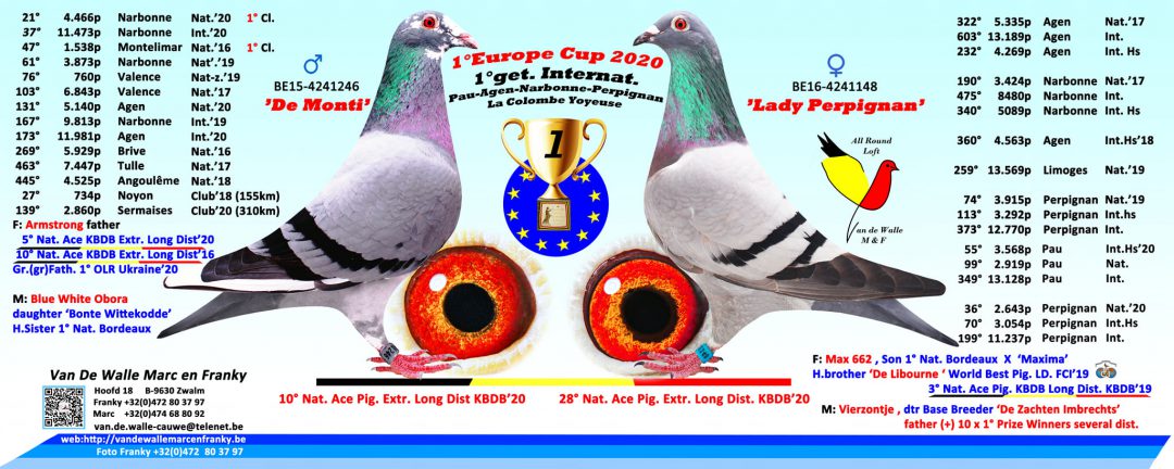As you can see on the 2 pigeons winning the 1. International Europe Cup Champions 2020 these 2 base pigeons are still very much responsible for the topresults today! Here are the 2 pedigrees of DE MONTI and LADY PERPIGNAN.