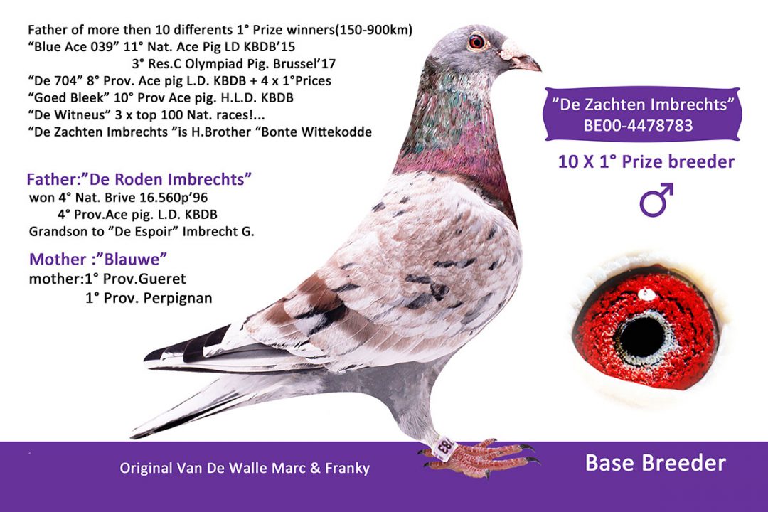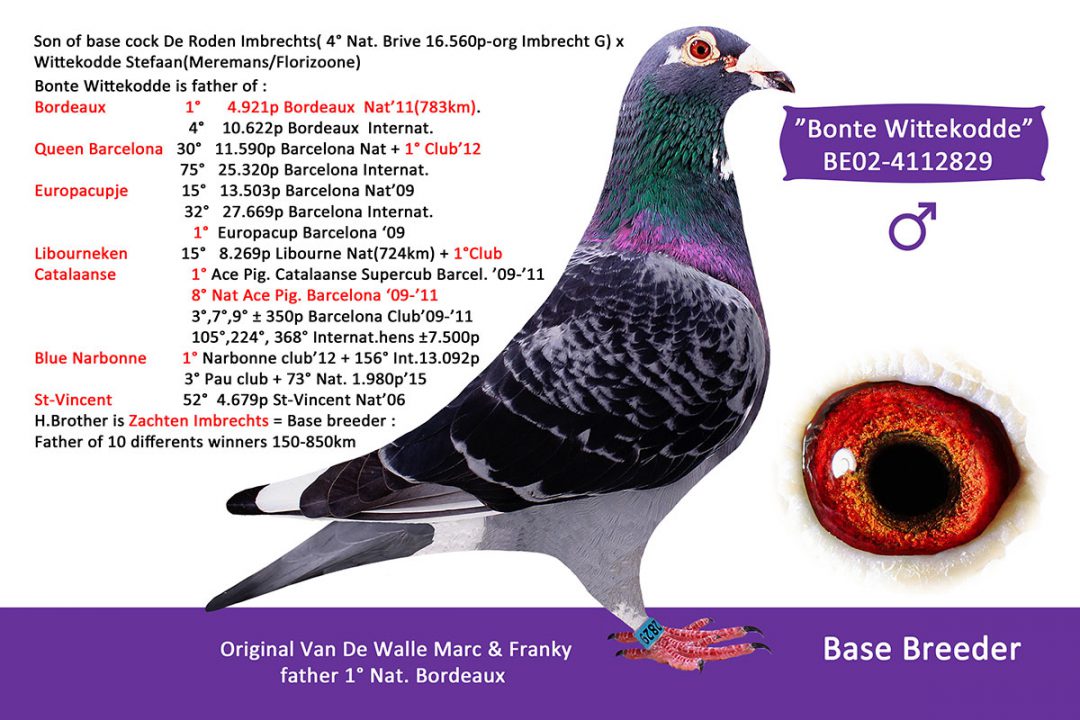 Still today the family is mainly built from 2 pigeons – BONTE WITTEKODDE and ZACHTEN IMBRECHTS – two brothers, just like Van De Walle. 90% of the pigeons on the loft come from these 2 toppigeons – a super family that can win from 150-1.065 km.